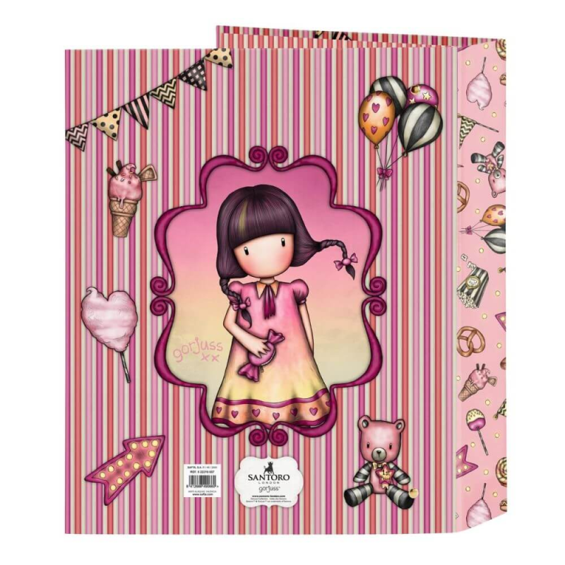 Biblioraftul A4 Gorjuss - Carousel este din carton tare, are in interior 4 inele metalice in care pot fi puse paginile proiectelor sau mape transparente .