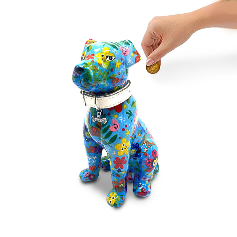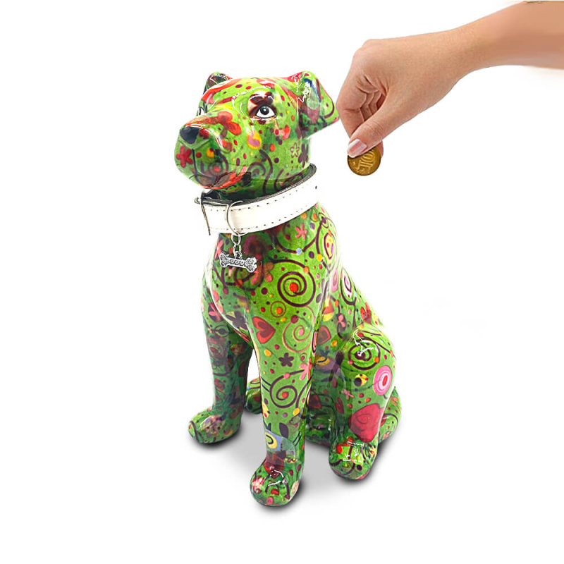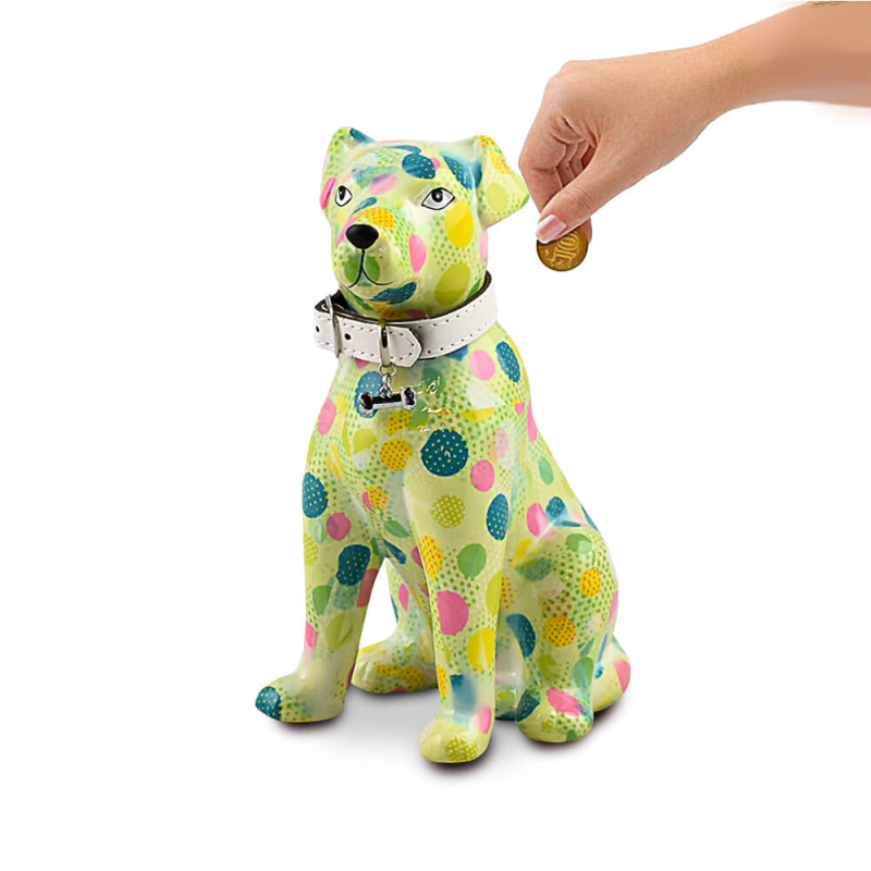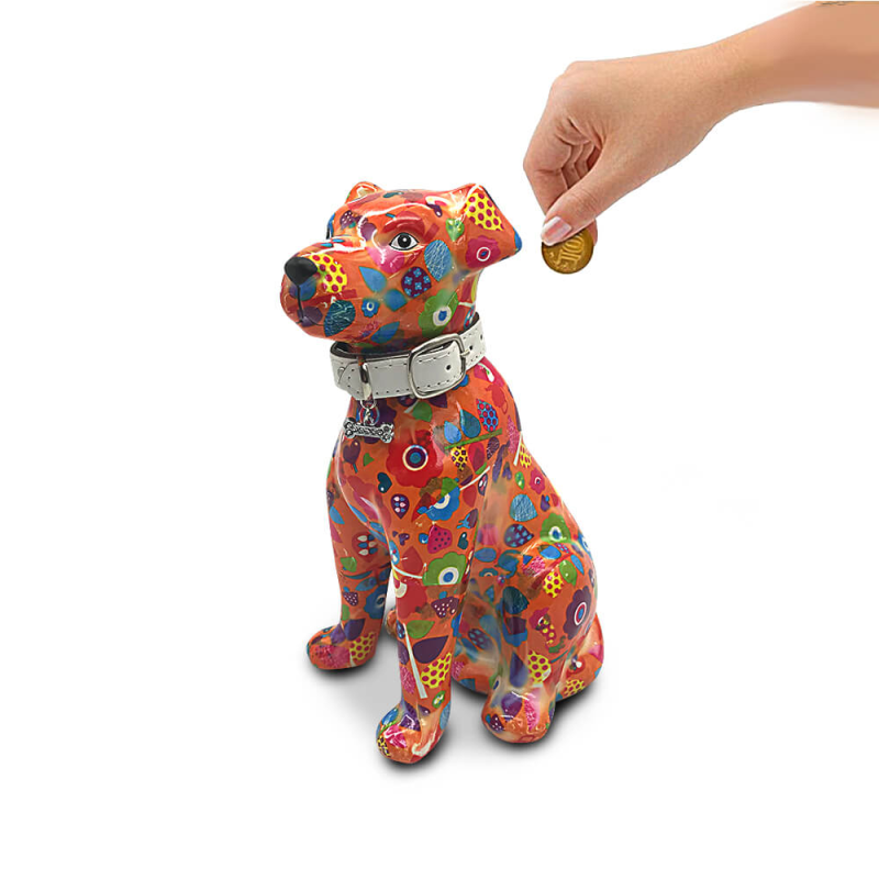 Cainele Mylo pozand mandru in hainutele colorate ale noului trend, este o piesa ceramica originala care se potriveste oriunde la tine in casa. El poate decora bucataria, holul, livingul sau dormitorul deopotriva si sta cuminte chiar si in baie. Secretul acestui catel decorativ din ceramica este ca poate pastra secretul economiilor tale ascunse in interiorul lui.