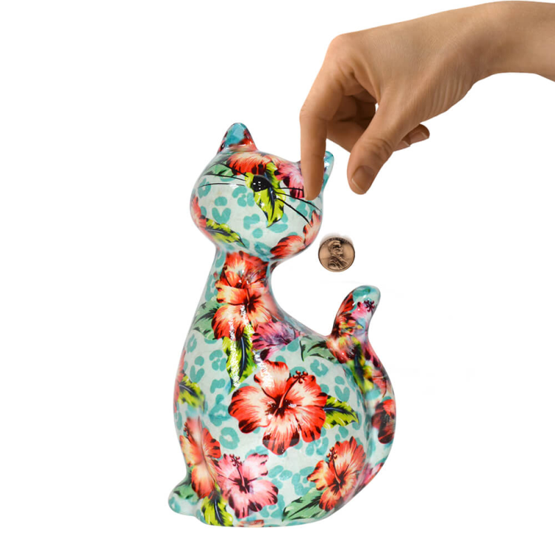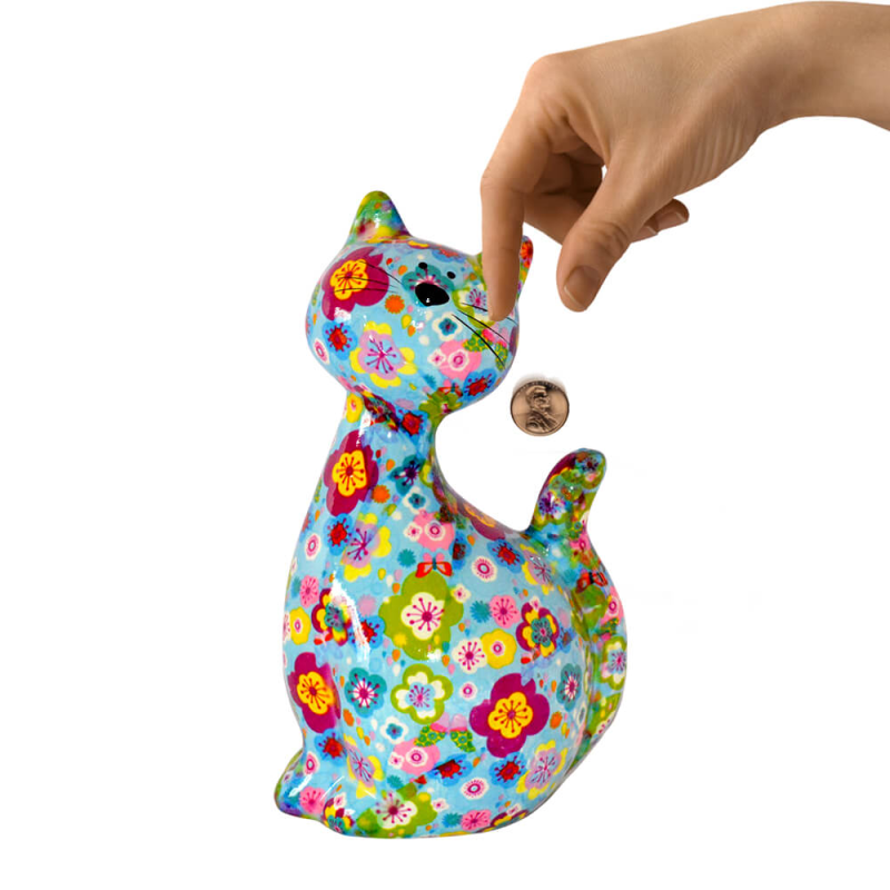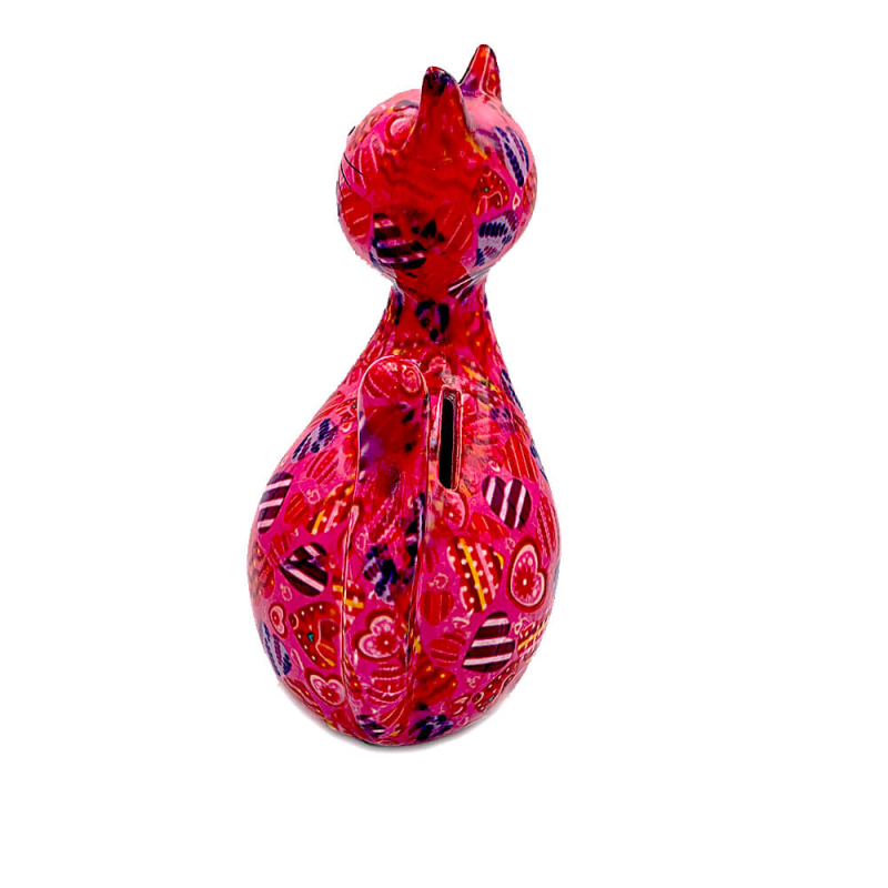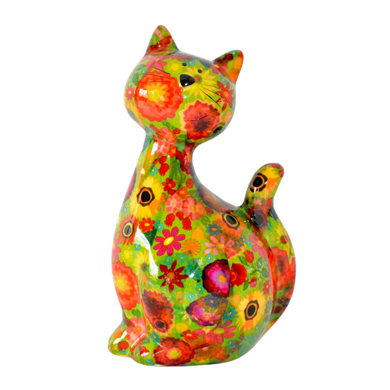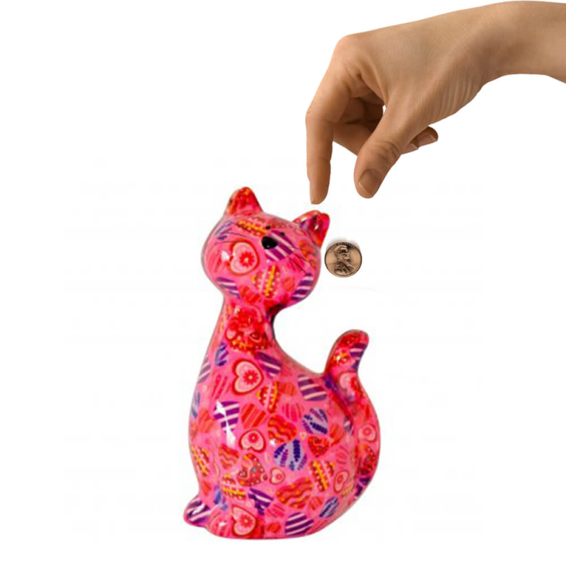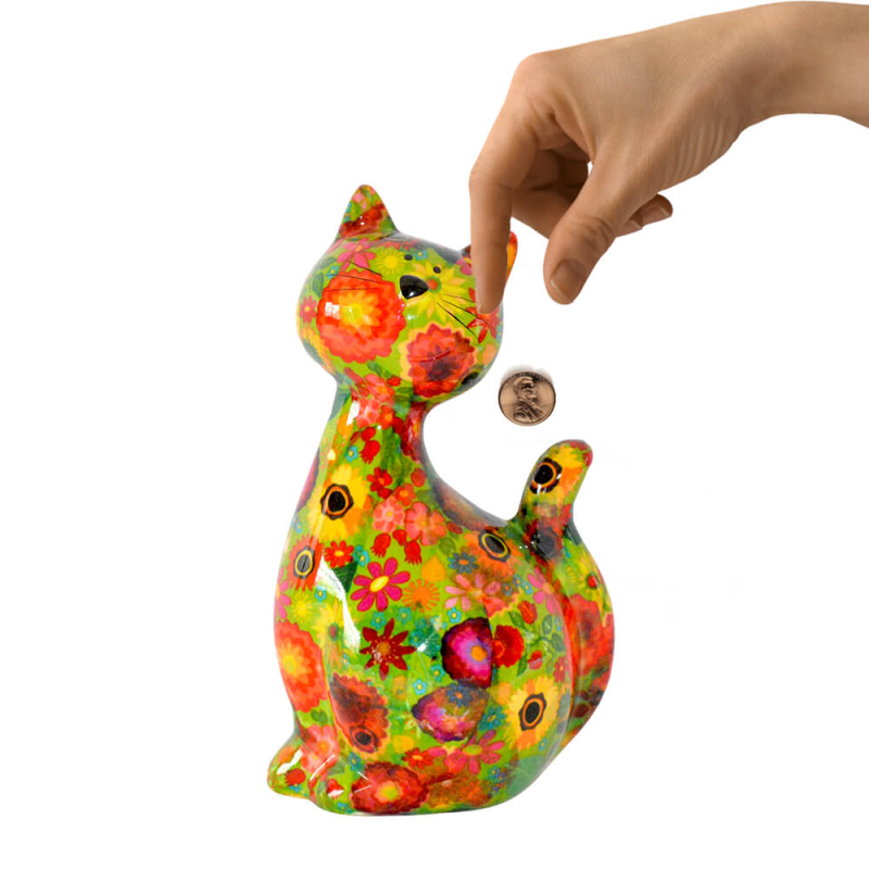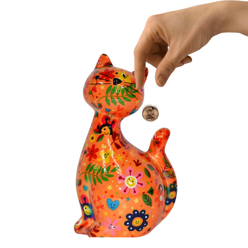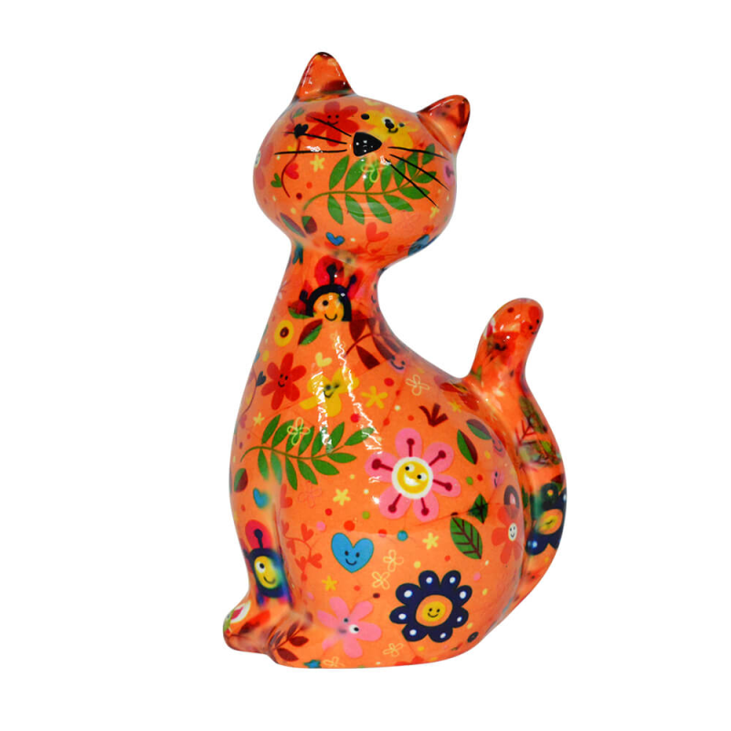 Pisicuta Caramel simandicoasa in hainute colorate in noul trend, este o piesa ceramica originala care se potriveste oriunde la tine in casa. Ea poate decora bucataria, holul, livingul sau dormitorul deopotriva si sta cuminte chiar si in baie. Secretul acestei pisicute decorative din ceramica este ca poate pastra secretul economiilor tale ascunse in interiorul ei.