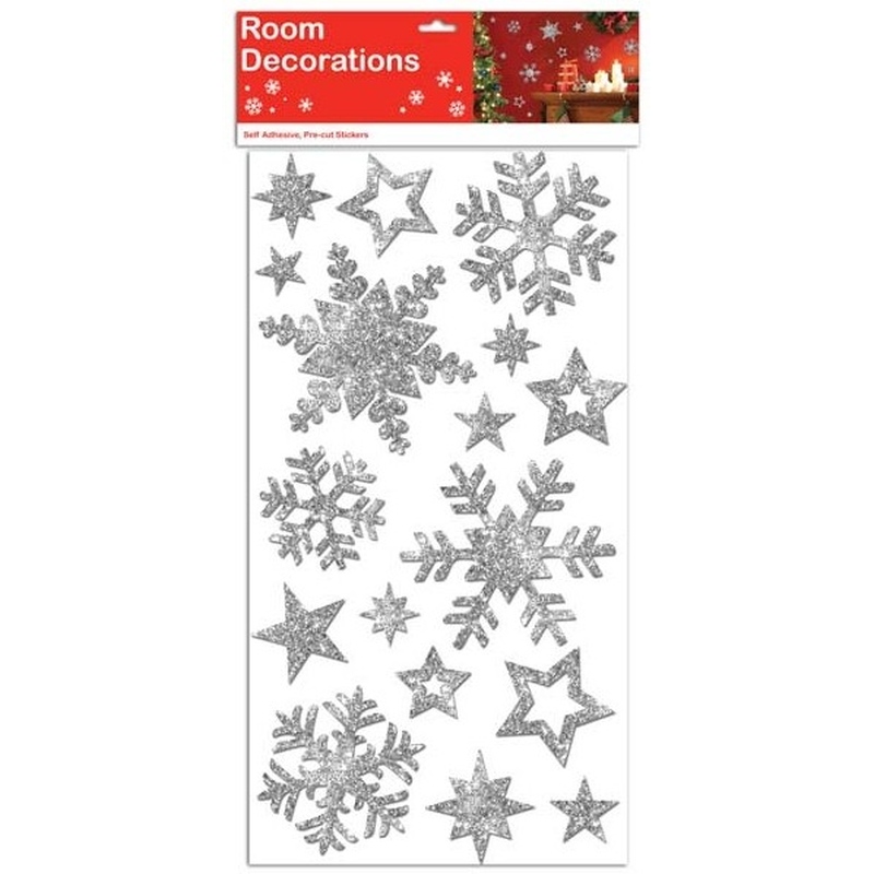 Un set decorativ cu fulgi de nea si stelute, avand pe spate adeziv special pentru a putea fi lipit usor pe perete.