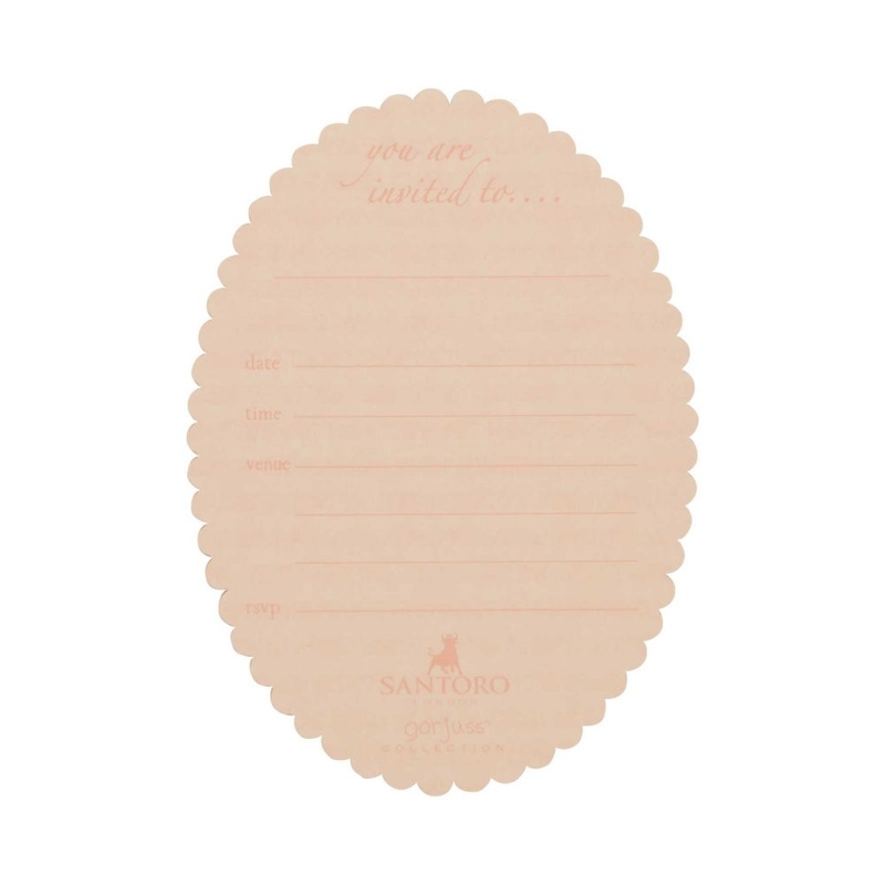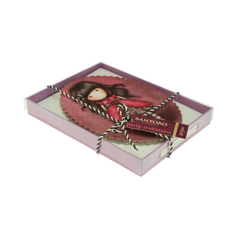 Setul de invitatii Gorjuss avand pe fiecare felicitare inscriptionate fetitele Gorjuss, Oops a Daisy, Hush Little Bunny, Ladybird, You Brought Me Love este setul ideal pentru orice petrecere cu stil. Setul contine 8 invitatii tiparite pe hartie superioara, avand fiecare cate un plic deosebit.