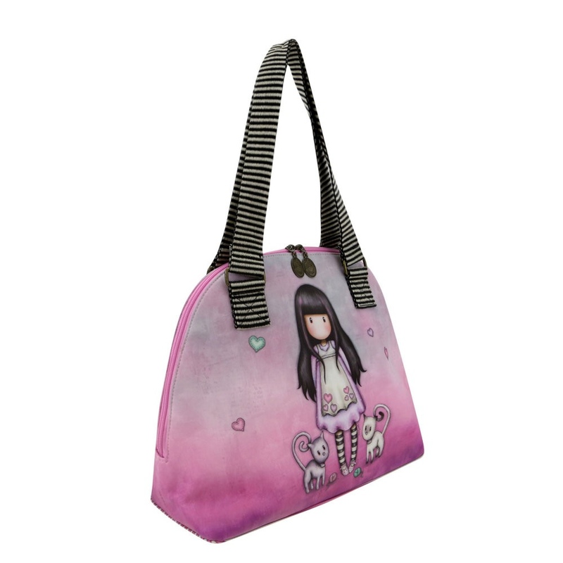Esti gata de plimbare? Aceasta gentuta cu barete textile Gorjuss Tall Tails de la Santoro este cea mai potrivita pentru tine! Frumoasa tematica Tall Tails care o ilustreaza pe incantatoarea fetita din colectia Gorjuss, impodobeste aceasta geanta cu o coloristica dragalasa, in nuante calde de roz, lila si gri.