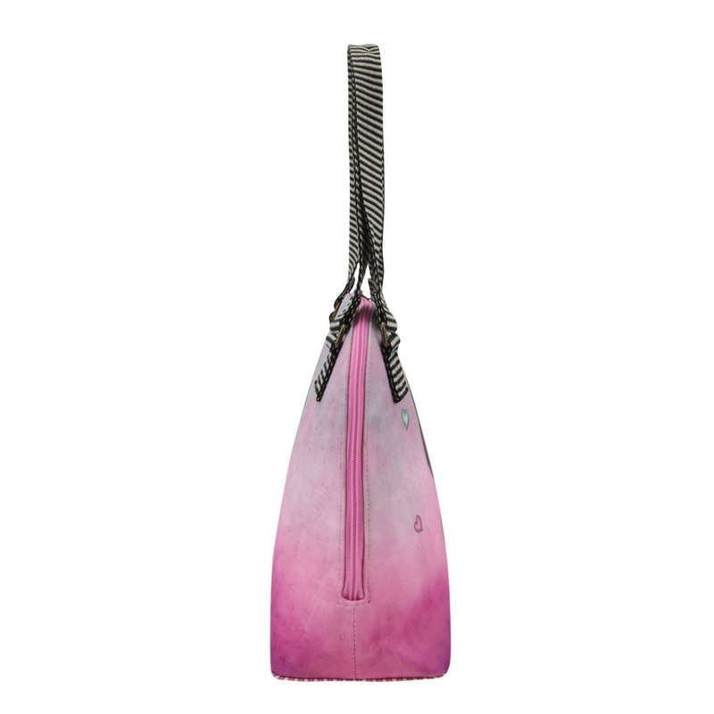 Geanta de la Santoro are manerele in dungi monocrome, pe fundul gentii are dungi roz si albe, iar partea din spate a gentii are un imprimeu in degradee cu inimioare delicate.