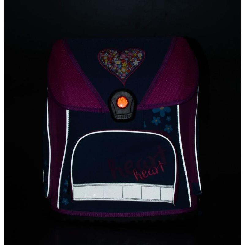 Ghiozdan tip rucsac anatomic are un compartiment mare, inchis cu un capac rigid, benzi reflectorizante pentru semnalizarea nocturna pentru siguranta copilului pe timp de noapte, iar pe fata are un buzunar frontal care se inchide cu fermoar. Baza rucsacului este rigida si cauciucata, in lateral are doua buzunare care se inchid cu fermoar, iar unul din ele are extensia din plasa pentru sticla de apa, bretele ajustabile in inaltime si special pentru umeri. In interior are doua separatoare si un buzunar care se ininchide cu fermoar. Rucsacul este decorat cu imaginea unui inimioare.