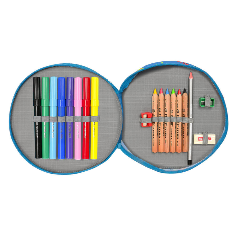 Este prevazut cu un compartiment inchis cu fermoar si contine instrumentele de scris necesare la gradinita sau scoala. Penarul contine urmatoarele instrumente de scris: 8 carioci colorate, 6 creioane colorate, 1 creion HB, 2 ascutitoare, 1 radiera.