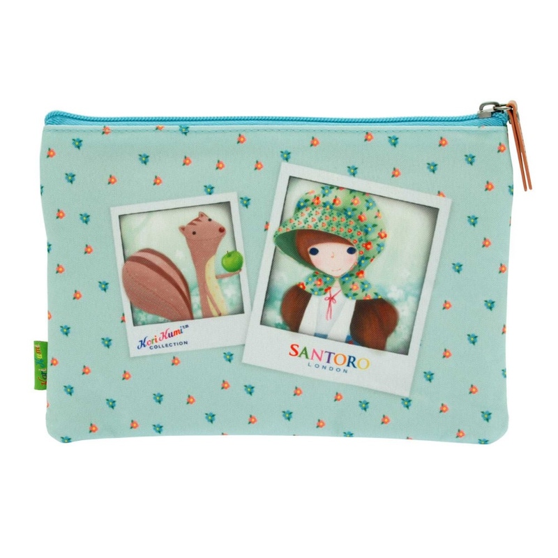 Designul incantator in nuante pastelate de verde, bleu si rosu pune foarte bine in valoare elementele creatiei Kori Kumi An Apple A Day de la Santoro. Penarul de la Santoro are un interior spatios pentru creioane si pixuri si este compus din doua compartimente pentru a-ti putea organiza mai bine obiectele. Captuseala din interior este decorata cu floricele albe.