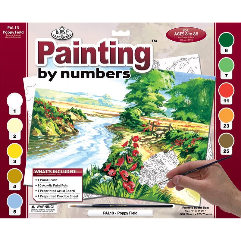 Avand materiale de calitate, fiecare set Pictura creativa pe numere avansati - Camp cu maci, cuprinde: un carton pretiparit de calitate de 28.6 x 39.05 cm, special pentru pictura in culori acrilice, cu linii in tonuri de gri, o foaie de exersare, 10 borcanele cu vopsea acrilica, o pensula si instructiuni usor de urmat.