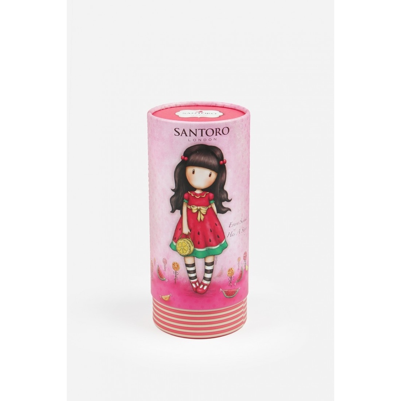 - Simpatica fetita din colectia Gorjuss Every Summer Has A Story de la Santoro este ilustrata in partea din fata a rochitei, purtand o rochita rosie, foarte draguta care seamana cu o mica felie de pepene. Decoratiunile din jurul fetitei sunt speciale, precum acadele pe bat si bomboane din feliute de pepene sau citrice.