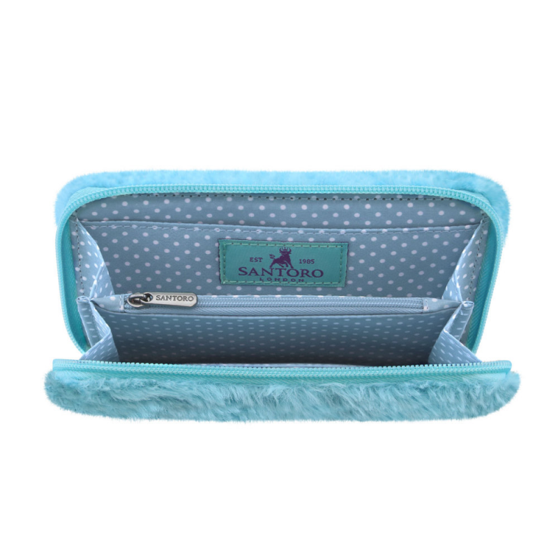 Acest portofel Gorjuss Furry este foarte colorat, invelit in blanita foarte fina, colorata, bleu. Pe fata acestui portofel Gorjuss o regasim pe micuta Bubble Fairy frumos inramata de o margine brodata, bleu. Pe spatele portofelului regasim logo-ul Santoro London. Porofelul se inchide cu fermoar, iar interiorul este bleu, cu buline albe. Portofelul are spatiu destinat pentru bacnote, pentru monede, care se inchide cu fermoar si 2 spatii destinate pentru carduri/carti de vizita.