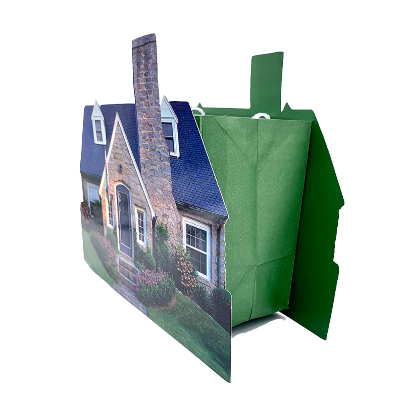 Cele mai fericite evenimente cum ar fi mutarea intr-o casa noua se cer marcate prin mici cadouri decorative. O impachetare perfecta pentru acest gen de cadouri este punga de hartie in forma de casuta. De ce? Argumentul este simplu, pentru ca este unica punga de acest gen, laturile profilate in forma unei case contureaza ideea urarilor nerostite dar subintelese de "casa de piatra". Fie ca ambaleaza un cadou de nunta, sau de casa noua, noi iti recomandam cu caldura aceasta punga pentru ca vei ramane de neuitat in amintirea lor.
