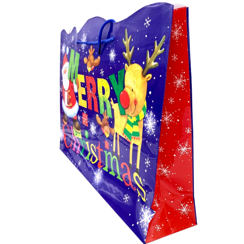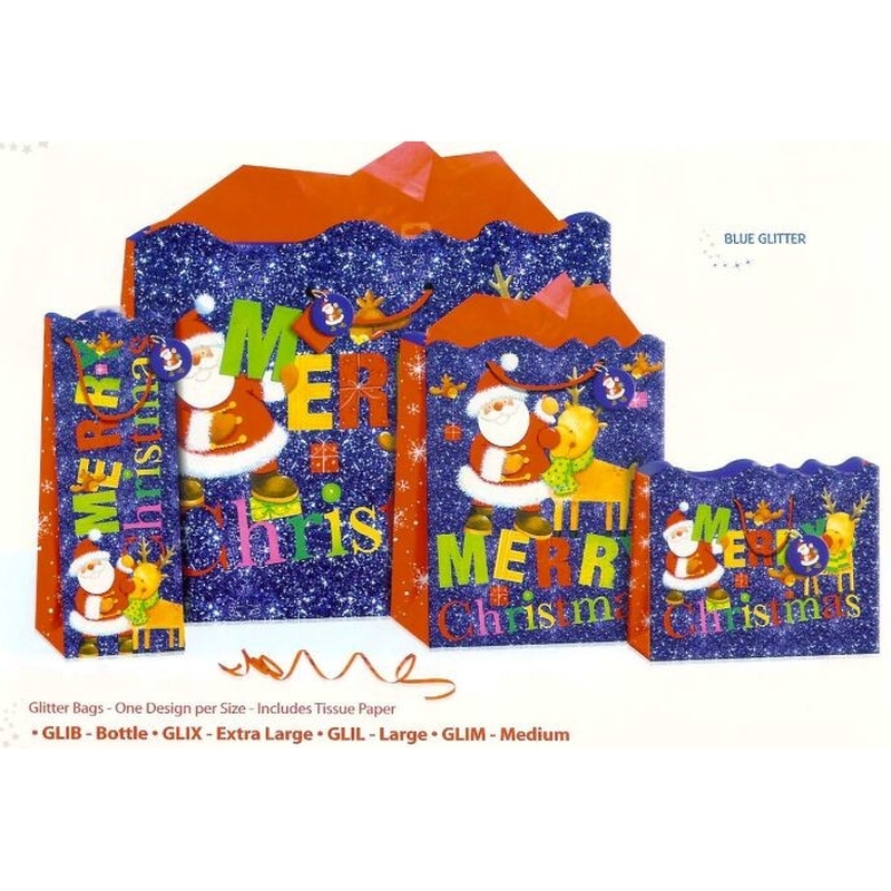 Manerul pungii este realizat din snur albastru.O minifelicitare si confettu sub forma de stelute rosii sunt atasate pungii.