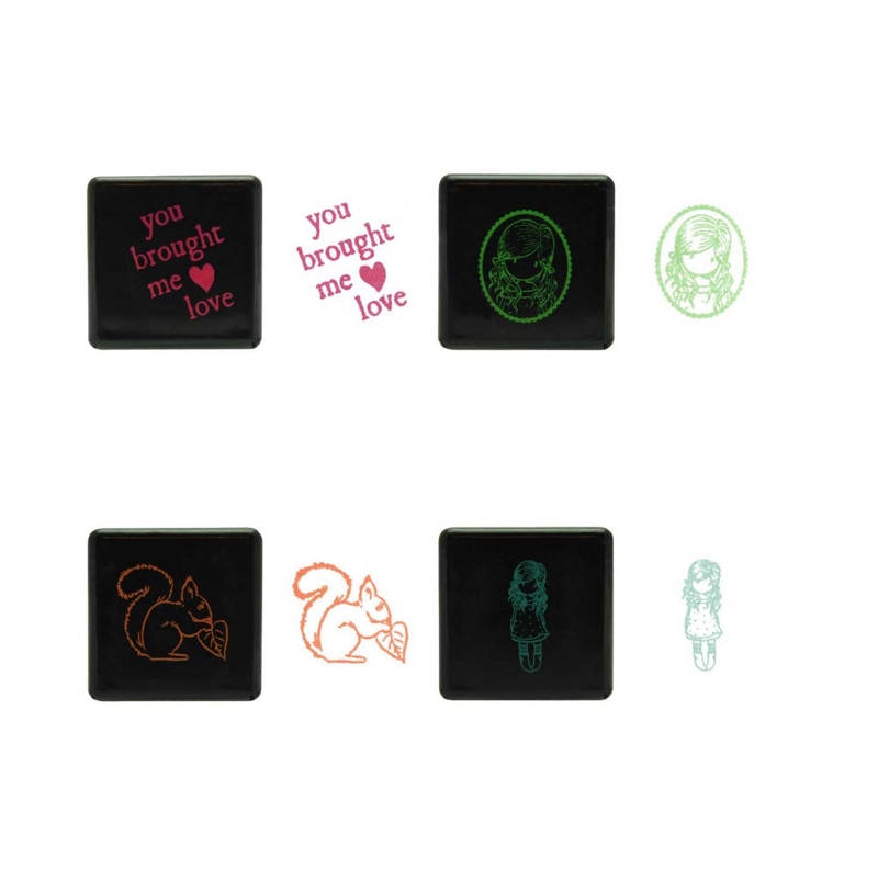 Setul cuprinde 4 modele de stampile cubice prevazute capac pentru protejarea modelului si a cernelei.