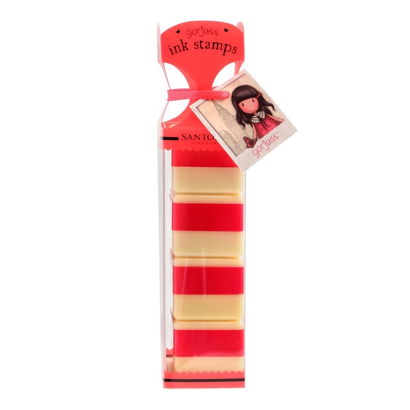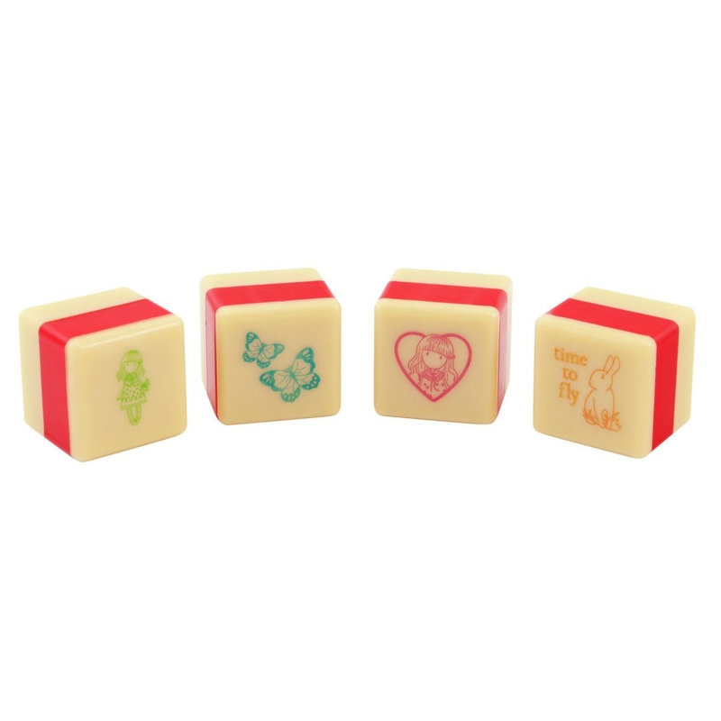 Setul de la Santoro cuprinde 4 modele de stampile cubice. Cerneala este protejata pentru ca fiecare stampila este prevazuta cu capac. Acestea vin aranjate intr-o cutie transparenta, accesorizata cu o fundita in partea de sus.