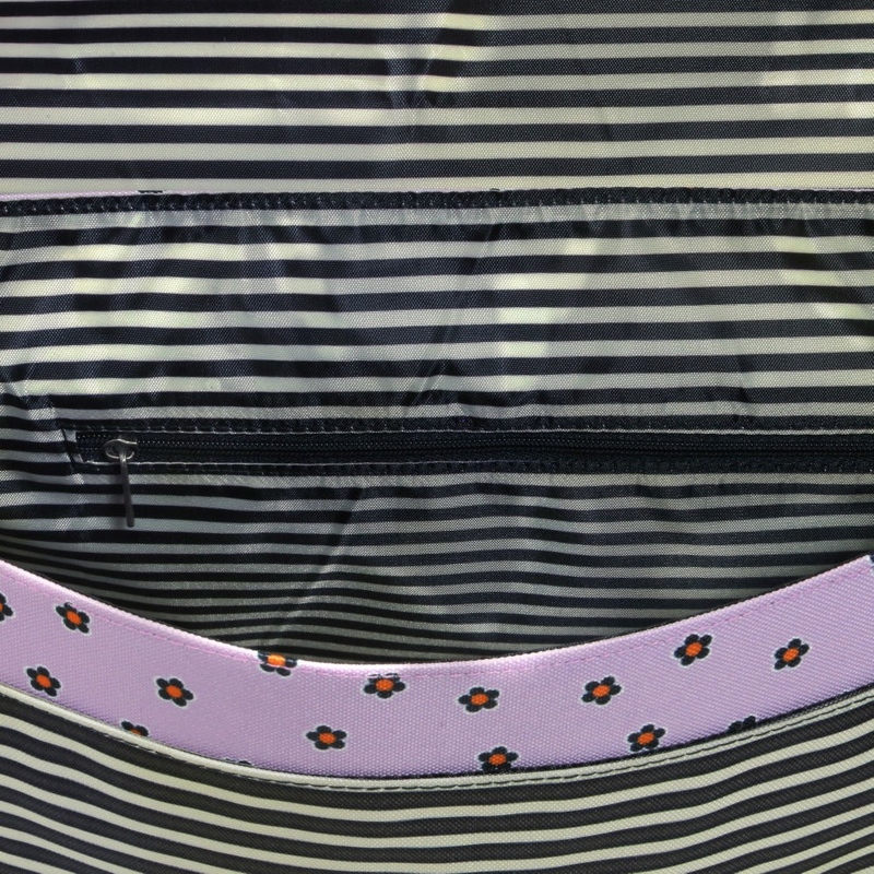 - Captuseala din interior este in dungi monocrome, extrem de elegante. Designul gentii este placut, in culori calde de portocaliu, lila si mov, avand imprimat un model cu flori pe partea laterala, iar pe partea din fata un model cu dungi monocrome.