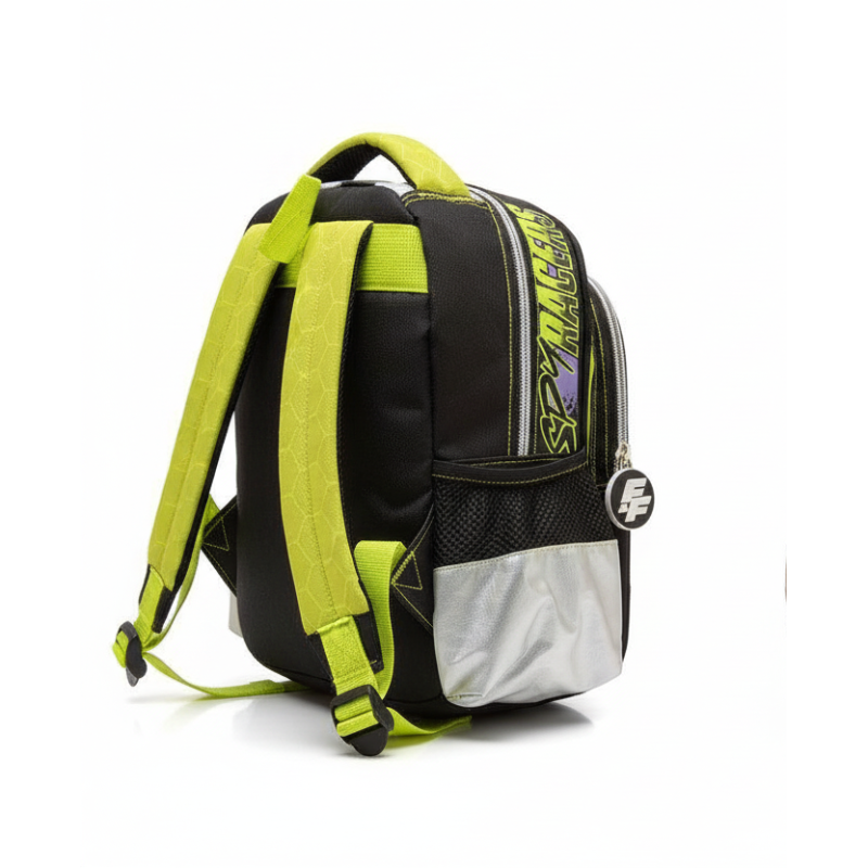 Ghiozdanul are doua compartimente captusite: unul principal, foarte spatios si un buzunar frontal. Toate compartimentele se inchid cu fermoare care au cheite din plastic cu initialele FF;