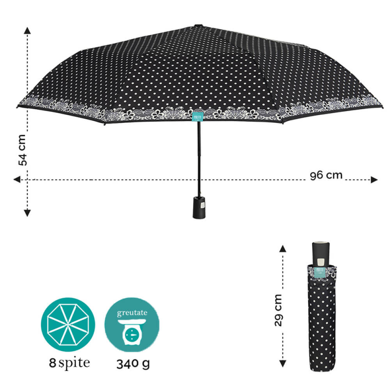 Am adaugat colectiei noastre de umbrele acest model in serie limitata, cu deschidere automata cu buline albe pe fundal negru. O umbrela eleganta si foarte trendy pe care o poti strecura usor in geanta sau rucsac pentru a fi pregatita in eventualitatea unei ploi de toamna.